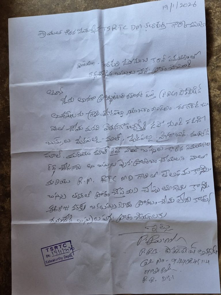 జనం న్యూస్ ప్రతినిధి, 20 జనవరి 2026, రంగారెడ్డి జిల్లా ఇబ్రహీంపట్నం నియోజకవర్గం ఇంచార్జ్ : యాచారం మండలం లోని మాల్ , మేడిపల్లి హైదరాబాద్, మేడిపల్లి మాల్ నైట్ హాల్ట్, ముద్విన్ మాల్ , మాడుగుల , మాల్ వివిధ గ్రామాలకు వచ్చే బస్సులను కల్వకుర్తి డిపో అధికారులు కరోనా సమయంలో రద్దు చేశారు. ఆ బస్సును పునర్ ప్రారంభం చేయాలని పలుమార్లు కల్వకుర్తి డిపో మేనేజర్ కి ,ర్ ఎం కు మరియు కల్వకుర్తి ఎమ్మెల్యే కి ఆర్టీసీ ఎండీకి గతంలో వినతి పత్రాలు ఇచ్చిన స్పందన లేదు డిపో మేనేజర్ కుంటి సాకులు చెబుతూ కాలం గడుపుతూ వచ్చింది. మరో మారు సోమవారం కల్వకుర్తి డిపో సూపర్ డెంటికీ బస్సు సమస్యలపై విన్నర్ పత్రము అందజేయడం జరిగింది డిపో మేనేజర్ అందుబాటులో లేకపోవడంతో సూపర్డెంట్ కి పి ర్ జి ఫౌండేషన్ అధ్యక్షులు ప్రొద్దుటూరు రవీందర్ గుప్తా కల్వకుర్తి డిపోలో వినతిపత్రం అందజేశారు ఈ సందర్భంగా రవీందర్ గుప్తా మాట్లాడుతూ త్వరలో బస్సు సమస్యలు పరిష్కారం చేయకపోతే కల్వకుర్తి డిపోకు సంబంధించిన బస్సులను అడ్డుకుంటామని తెలిపారు.